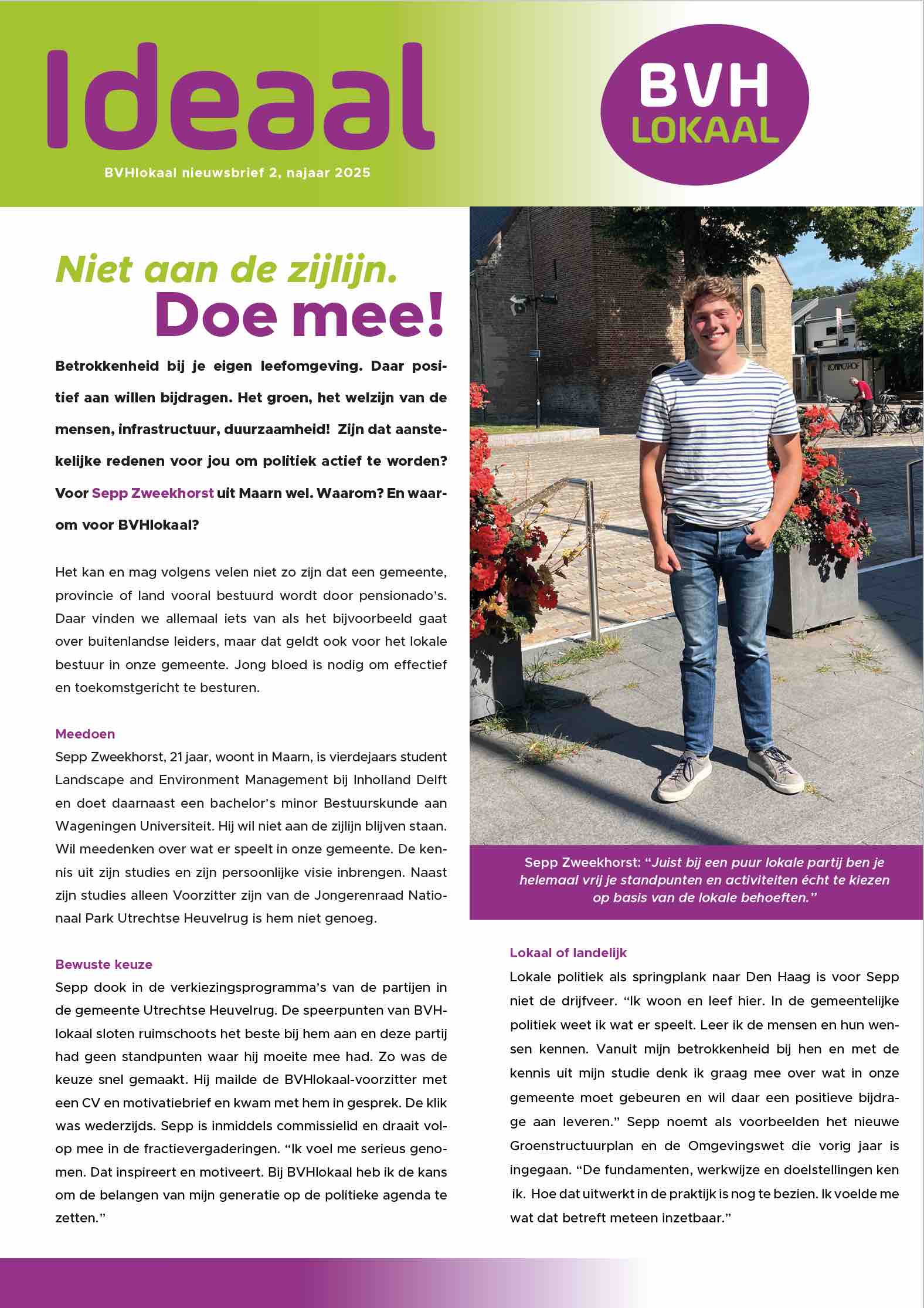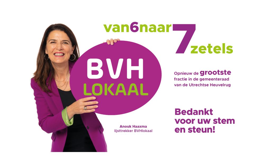 BVHlokaal is de enige, puur lokale politieke partij in de gemeente Utrechtse Heuvelrug zonder binding met de landelijke of provinciale partijpolitiek. Wij kunnen daardoor geheel zelfstandig en voor 100% opkomen voor de belangen van de inwoners van Amerongen, Doorn, Driebergen-Rijsenburg, Leersum, Maarn, Maarsbergen en Overberg.